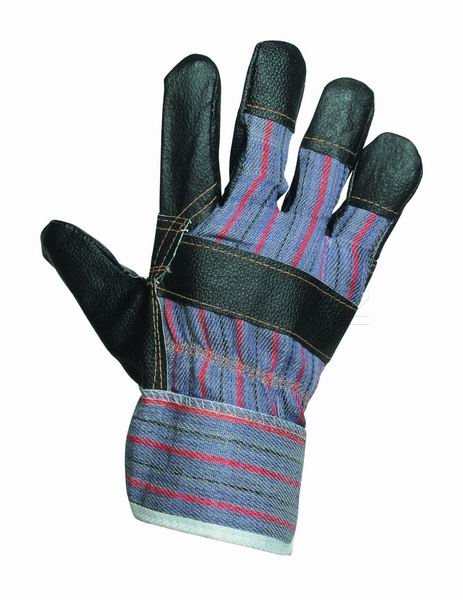 Pracovní rukavice z jednobarevné lícové nábytkové hověziny v dlani s podšívkou a bavlněné tkaniny na hřbetu a manžetě.