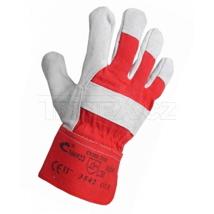 Pracovní rukavice z jednoho kusu silné hovězí štípenky v dlani s podšívkou, bavlněné tkaniny na hřbetu, s bavlněnou manžetou, celokoženými palci a ukazováčky a překrytými špičkami prstů.