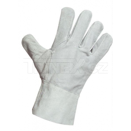 Pracovní celokožené rukavice bez podšívky z hovězí štípenky, se 7 cm širokou manžetou a zesílenou dlaní a palcem.
